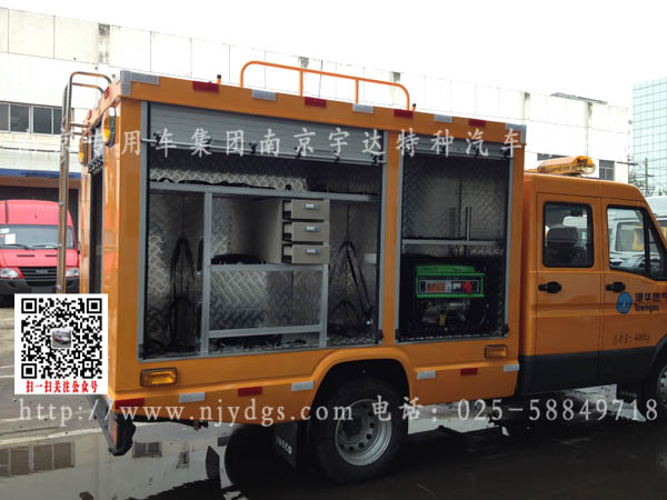 该车改装一切依据用户自定义要求改装,该车配备长条全黄警灯、四周爆闪灯、后舱工具柜花纹铝板、扎带固定工具、地环、等用于固定抢险设备。抢修设备可自带也可以委托我司订购,后箱体根据抢险设备改装。