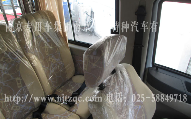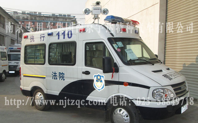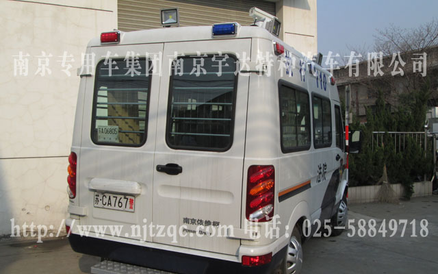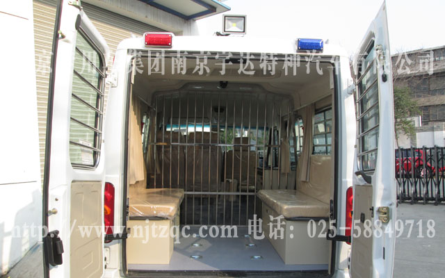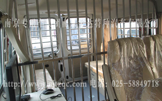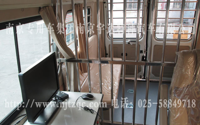 驾驶室的原副驾驶座椅取消翻新、后舱地面铺LG地板皮及6个地环、配备后上车踏板、警灯凸台、长条警灯、四周爆闪灯、全车布线及面板、不锈钢囚笼下封有机玻璃、17寸电脑显示器、操作柜、硬盘录像机及后舱半球监控器、后舱电瓶、车顶监控、后舱座柜、逆变电源、泛光灯等一些设备。该车经过设计师设计,合理的安排了整个空间,使的整车更美观实用。