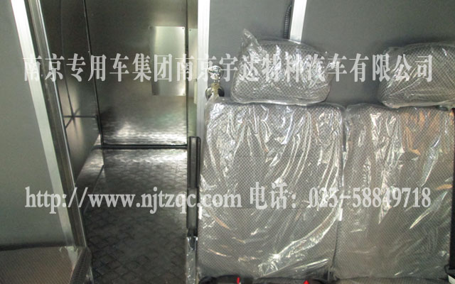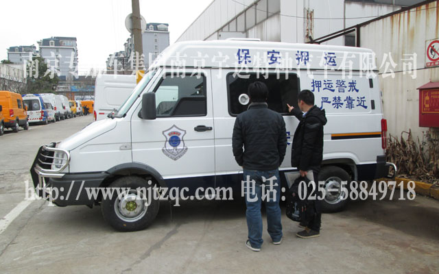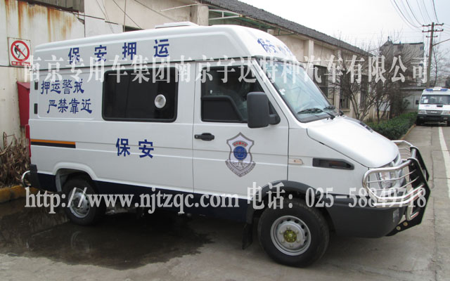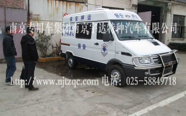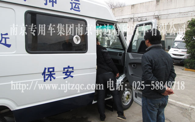 车内设置一个带开门隔断,将整个车体分为驾驶室、押运舱和运钞舱两大部分。该车内部配备了双人座椅、折叠座、副驾驶单人可翻座椅、车内外摄像监控系统、车地面铺花纹铝板、照明灯装置、全车防弹玻璃、射击孔、电动升降文件传递口、逃生窗、机械防盗门锁、液晶显示器等安全设备。整车防弹防撬、油箱等关键部位也做了防弹措施,运钞舱所有窗户进行了封闭处理。加装了专用警报器以及金属防撞前后保险杠,整车达到了国家安全部A级防弹标准。标准防弹运钞车外观,字样:武装押运,靠近危险等标识。