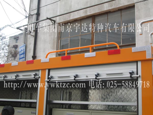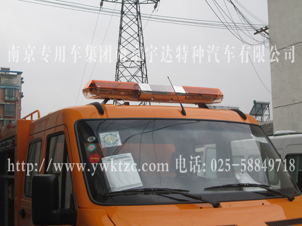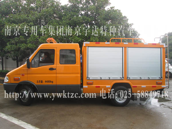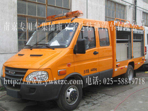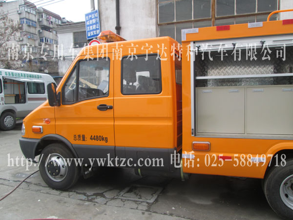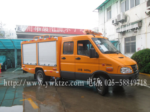 该车身全黄,车顶凸台40W长条全黄警灯、车顶四周爆闪灯、内铺花纹铝板、中隔断把整车分为驾驶舱和工具舱、工具舱里设有工具柜箱体模式、箱体配有卷帘门、车辆外观贴有抢险车字样、后箱体梁下舍友1700深度的工具柜以及各种阀门开关工具、该车配备防爆风机、俩台呼吸机以及发电机、还配备了市电接口等抢险设备。