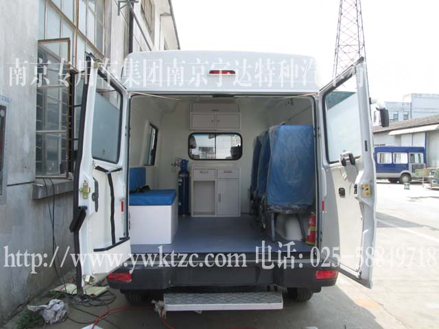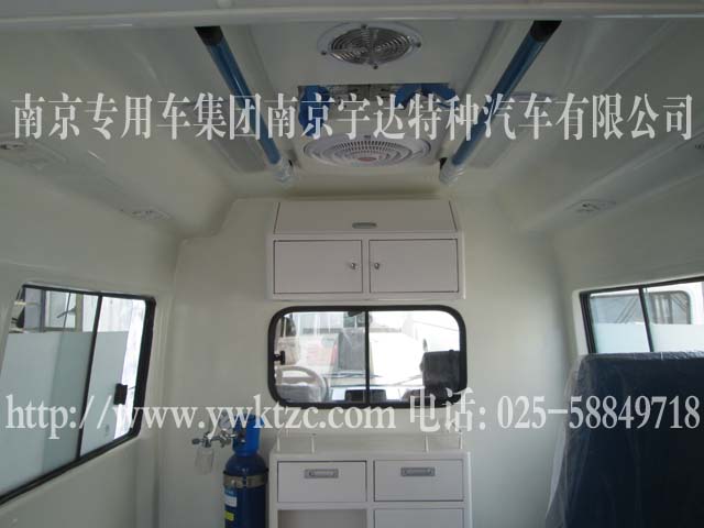 该车主要改装配置:A35玻璃体一体式模具内饰、2.5排量、副驾驶双人座椅、移窗隔断、后舱左侧长条座椅、隔断工具柜、氧气瓶及支架、垃圾桶、副驾驶后侧3个单人座椅、顶置换气扇、医用地板、照明灯、输液挂钩、紫外线消毒灯、后空调、后暖风、后上车踏板、长条警灯、四周爆闪灯、救护车辆外观。
