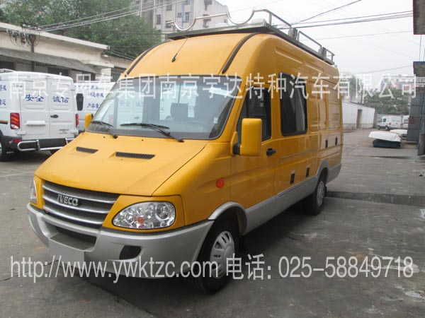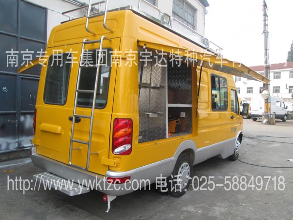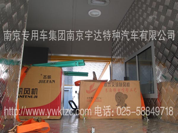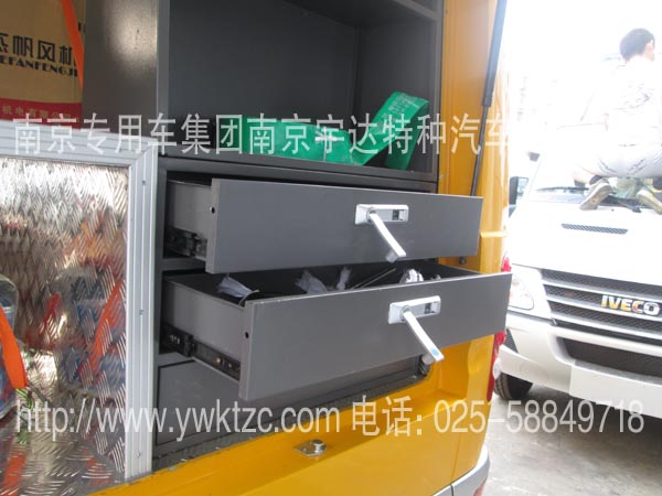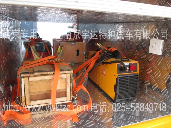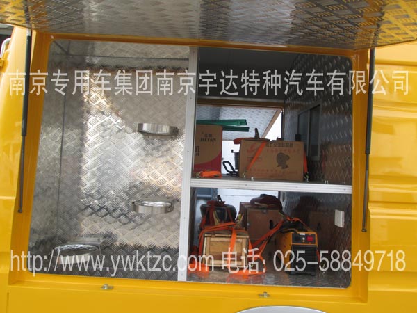 车顶安装高杆照明灯(1.8米高),车后加装发电机,左右俩边开上掀门、工具开门、车顶行李架、照明灯、写字台、翻板座椅、对外货架、发电机固定托盘、外接电源、全车布线、电器控制盒。车里配备污泥泵、葫芦、315电焊机、轴流风机、鼓风机等一些抢修检测设备以用来保证抢修抢险作业顺利完成。
