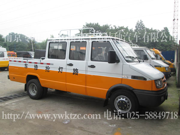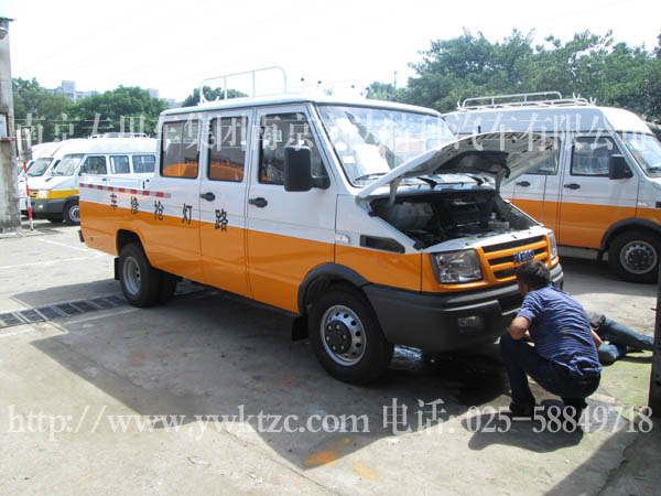 车辆外观“上白下黄”贴“路灯抢修车”字样、中央空调、后爬梯、尾门为对开门、 随车工具。