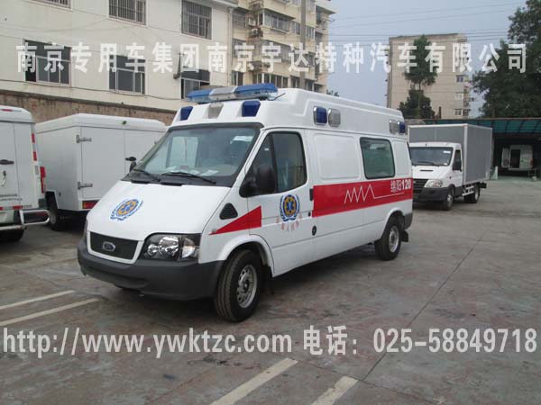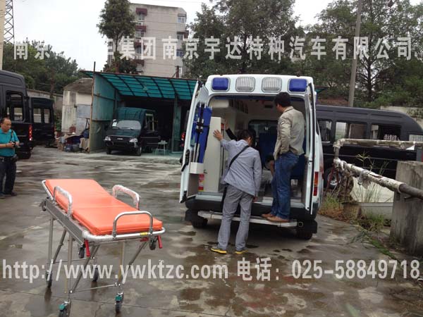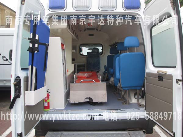 国际流行的福星顶救护车、100W的LED警灯以及四周15个爆闪灯(左右各4、前3后4)、加装后上车踏板、玻璃钢一体式模具内饰、配备照明系统、逆变电源系统、排风系统、紫外线消毒系统、前后对讲系统、带移窗隔断、医生看护座椅、家属陪同座椅、并配备了自动上车担架以及折叠担架、2个10升氧气瓶、前后2个输液挂钩、污物桶、侧门上车扶手等用于医疗抢救设施。
