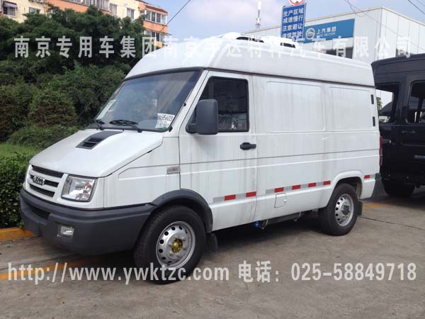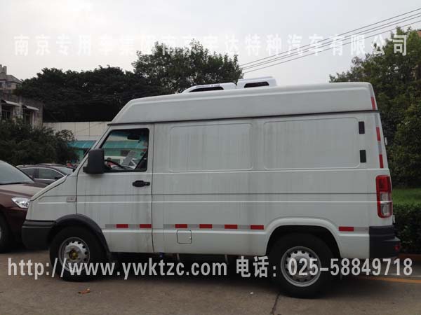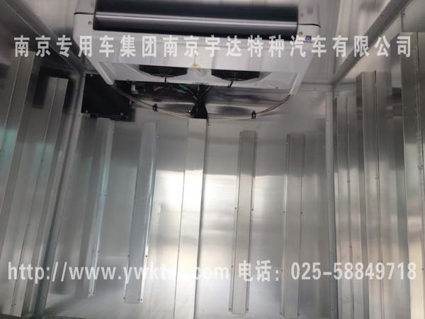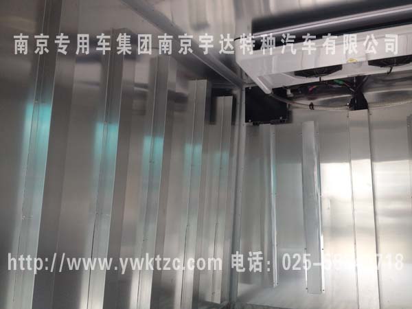 原车拆除后仓内蒙皮及内饰,利用原车外蒙,在内壁加装保温层,进行二次发泡,最后进行内饰处理,车厢四周以及通风管道选用不锈钢加工制作,地面导风槽铝合金都是根据GSP认证制作,用我公司成熟的制作工艺制成隔热车厢,充分利用原车外形进行运输箱体的改装,改装部分设计合理、可靠、箱体机构牢固、外形美观、隔热性能良好,内饰为铝合金花纹板材质,制冷机组采用K牌T135顶置式非独立制冷机组,厢内可控温度可达到+8℃~-8℃;加装备电系统,