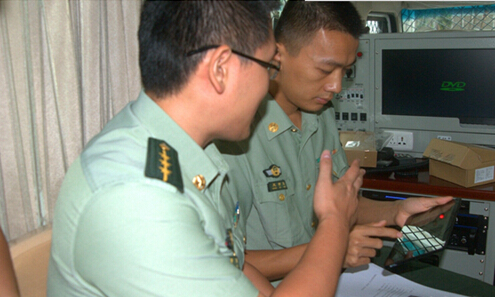 图为官兵们正在学习使用车内无线移动终端