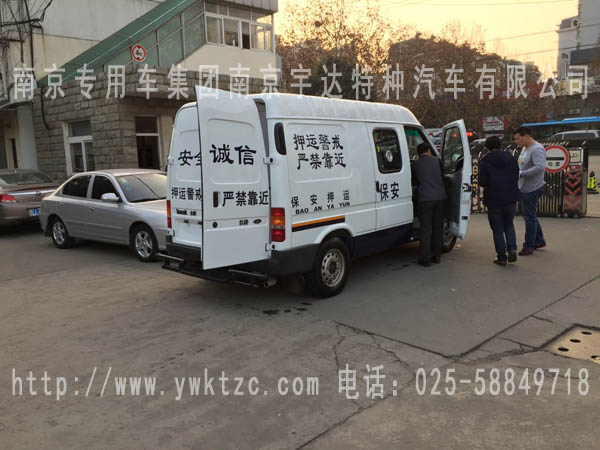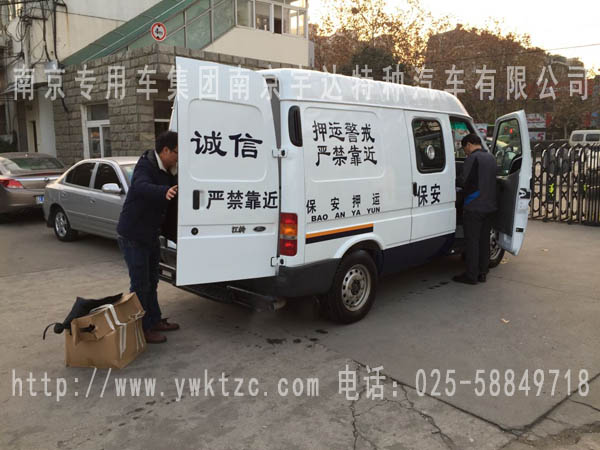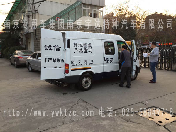 该车选用江铃经典全顺短轴中顶这款车进行改装,整车整体为白,下保险杠为深蓝颜色,喷押运警示标识,原车的空调系统、多媒体播放系统,原中侧拉门改为中推拉门并配备中控门锁,2+1三人押运员座椅,第三座椅可翻折,两点式安全带,驾驶舱电动升降射击口兼票据传递口,押运舱暗藏式射击口,手动通风逃生天窗,中隔断带滑动式隔离门,无锌花镀锌板钞箱内板,两侧内板瓦楞状,花纹钢板轮罩,运钞舱花纹钢板地板,双层双开钞箱后门使得整个过程中更安全,钞箱后门多项锁,车尾后踏板,可切换双镜头彩色监控系统(倒车以及运钞舱监控图像)半球监控摄像头,前防护保险杠,警报器,整车押运车及驾驶舱全为防弹,达到国家防弹A级标准。
