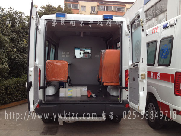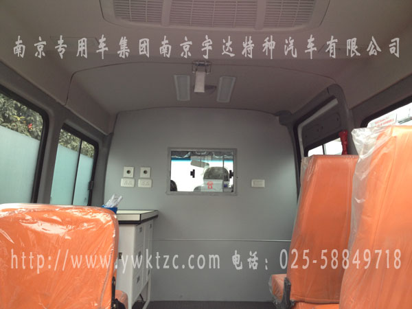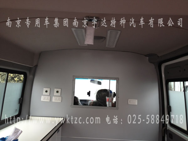 该车因客户要求,简单改装,正副驾驶后移窗隔断,正驾驶后方,医疗橱柜,下有暖风机,及氧气瓶和支架,左侧可躺座椅一个,右侧单人座椅俩个,加装医疗挂钩俩个,紫外线消毒灯,排风口等医疗设备。