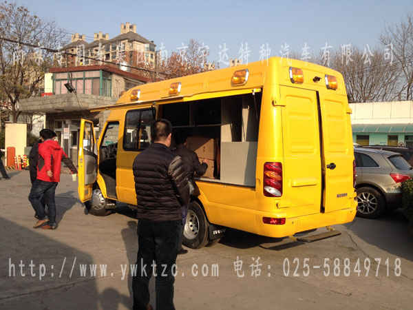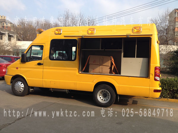 整车为全黄外观,车顶全黄警灯及四周爆闪灯,整车俩排座,中隔断把整车分为驾驶舱和工具仓,且后窗全部改装为盲窗,整个工具仓地铺花纹铝板,耐用耐磨损,车厢俩边各开俩大上掀门,后舱加装照明灯,工具柜子,车顶泛光灯及搜索灯,车厢还配备氧气乙炔支架,空压机,防爆泛光工作灯,全方位自动升降工作灯等一些抢险设备。