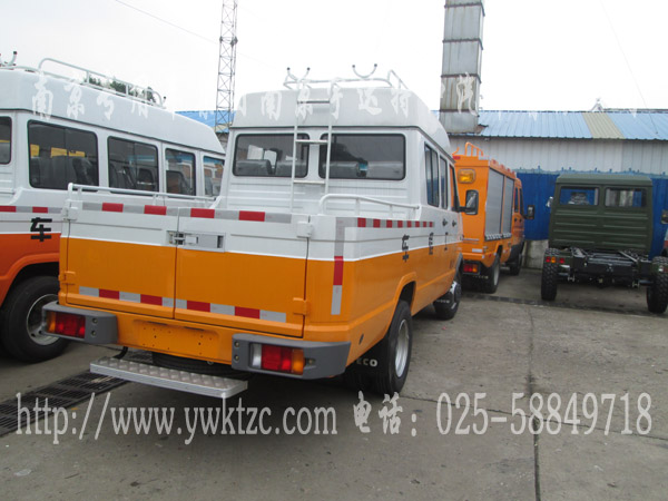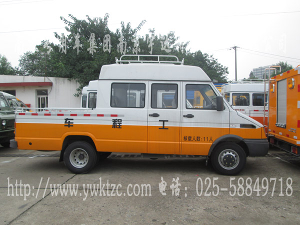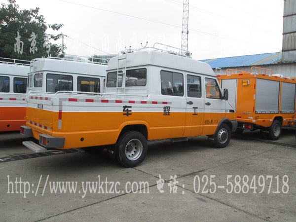 车辆外观“上白下黄”贴“工程车”字样、中央空调、后爬梯、尾门为对开门、 随车工具。
