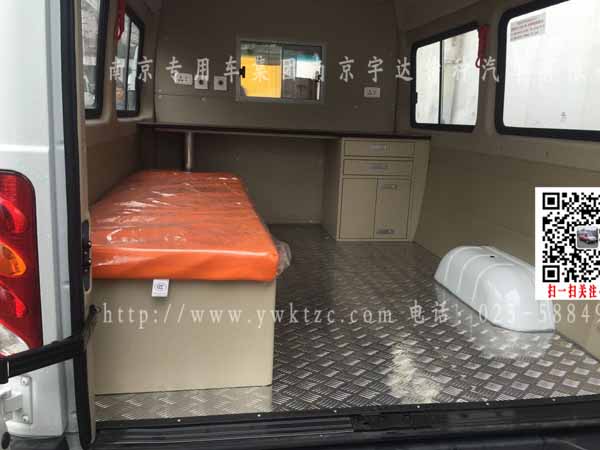 根据客户的要求,该车主要用于县村级以下使用,所以该车改装相对于简单,主要改装是车顶的长条警灯、医疗舱内的花纹铝板地面,驾驶员后带移窗隔断、逆变电源系统、长条沙发不带靠背、医疗柜以及操作台、副驾驶的双人座椅、后舱照明灯2个。消毒灯、医疗挂钩、通风口等医疗常用设备以及加装后上车踏板。