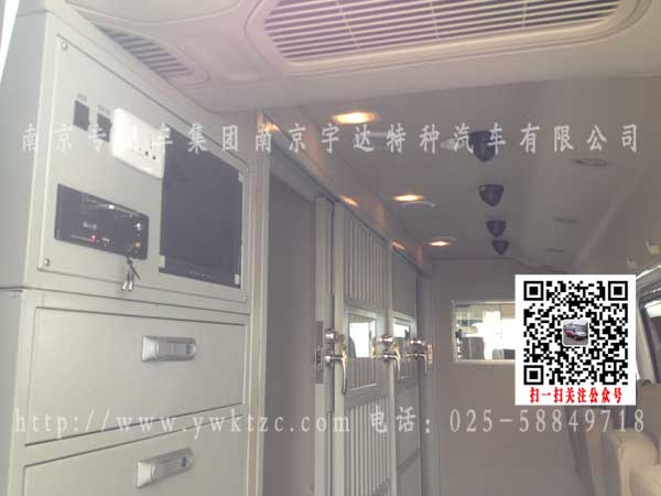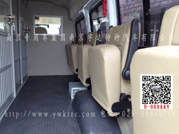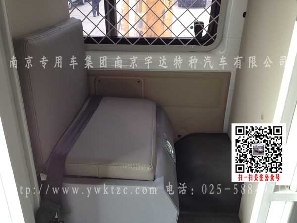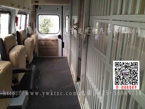 该车选用了新款江铃全顺新时代中顶长轴作为底盘进行改装,全程进行一对一的法警看护,国内首批特制押解囚车,该车配备了100W红蓝专用警灯,俩侧LED红蓝爆闪灯,04款警用标识,车顶同时也配备了蜗牛警灯。驾驶员后配移窗隔断,押解舱4个特制囚笼,前后软包,5个法警看护座椅,全程押送一对一看护,囚笼里配备了手环脚环,窗户玻璃也采取了特制防护网,也配备了独立暖风,押解舱4个监控摄像头,设备器械柜,硬盘录像机,显示器,后门锁改装,使得该车更安全,更有效的看护囚犯,使得任何不良行为扼杀在摇篮之中。