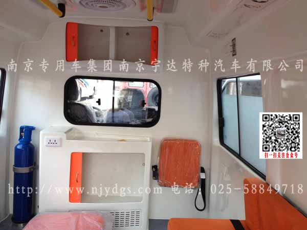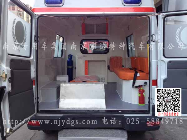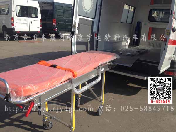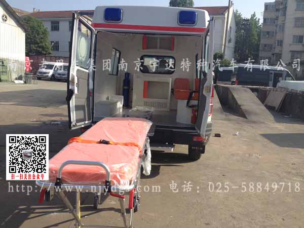 1、流行救护车外型2、车身广告系统(客户供样)3、医用救护座椅4、车厢左侧轮包包装起来5、上车自动担架6、灯光照明系
