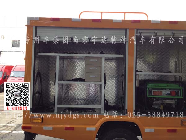 该车改装一切依据用户自定义要求改装,该车配备长条全黄警灯、四周爆闪灯、后舱工具柜花纹铝板、扎带固定工具、地环、等用于固定抢险设备。抢修设备可自带也可以委托我司订购,后箱体根据抢险设备改装。