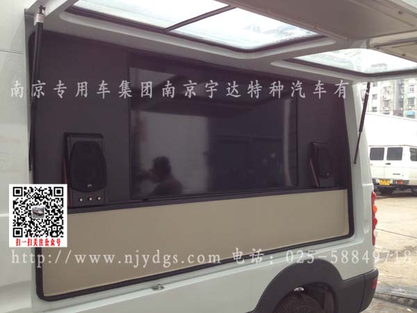 该宣传展示车选用依维柯NJ6484CCM前后空调底盘进行改装,副驾驶可翻转双人座椅;正副驾驶后开大上掀门、正驾驶后上掀门用于电视及喇叭宣传作用;副驾驶后大上掀门用于产品展示、LED灯光照明;加装电气柜用于存放功放机、DVD、100AH电瓶、等一些电器宣传设备;逆变电源系统;外接电源系统及30米绕线盘一套;车内照明系统、长条LED灯。该车外观漂亮、省油、上蓝牌C1驾照就可驾驶、操作简单方便、经济实惠性价比高、是用于产品宣传展示的不二物选。