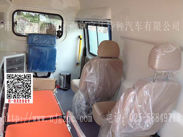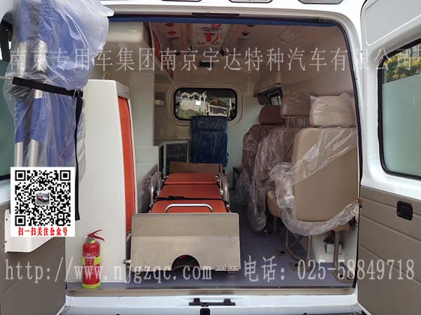 国际流行救护车方顶及外型;玻璃钢一体式模具内饰;长条警灯;爆闪灯;照明;灯密封中隔断;医生座椅;3张单人座椅;自动上车担架;折叠担架;2个10升氧气瓶;前后对讲系统;逆变电源系统;医疗柜;紫外线消毒灯;排风系统;照明系统;内饰系统;医用地板;前后2个输液挂钩;侧门上车扶手;担架仓;车身广告系统(客户供样)。