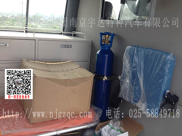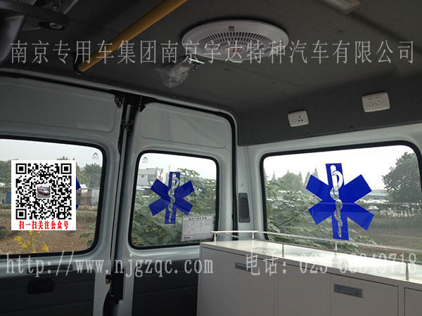 该车中隔断带移窗、前后对讲机系统、紫外线消毒系统、空调冷暖系统、医疗舱侧壁照明系