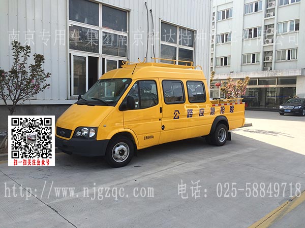 该车配备中央空调、车顶行李架、后爬梯、外观全黄、贴公路应急抢修字样。