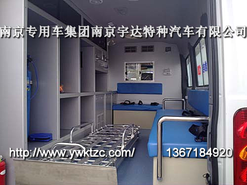 选装后门加宽上车踏板、选装换气扇、选装侧拉门、选装盲窗、选装标志灯凸台、选装周边爆闪灯、选装ABS型号:BOSCH ABS8、车内配有药品柜、救护担架等救护设备、自动上车担架、简易担架、担架舱、担架固定装置、不锈钢挡板、地板、中隔墙、对讲机、逆变电源、外接电源、30米电缆盘、电源插座、座椅、灭火器、污物桶、氧气瓶、湿化器、救护车外观等。