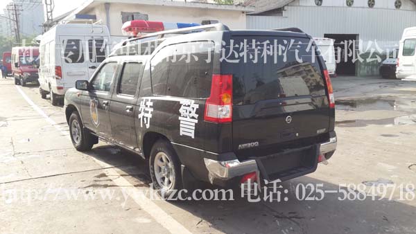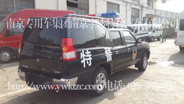 车顶安装长条警灯、全黑外观、全车5座、前后安装隔断隔开、地面铺花纹铝板、后舱制