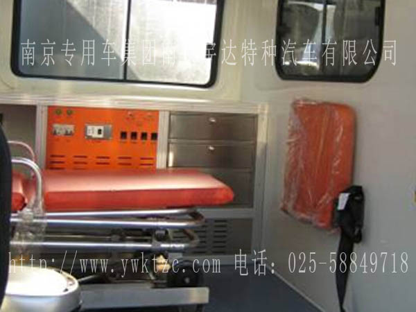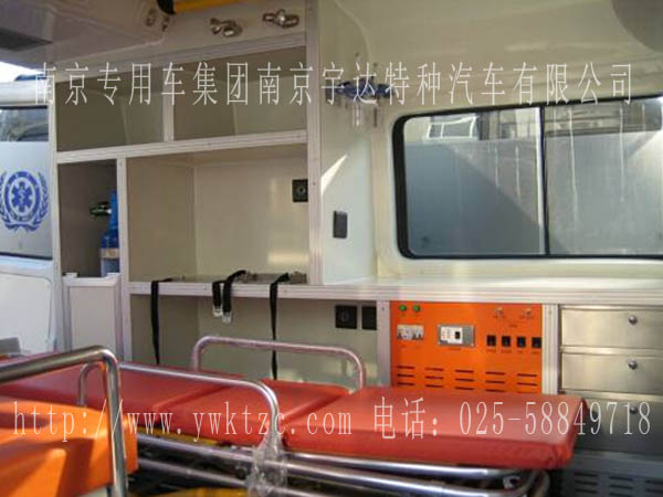 车担架床及固定装置、带窗隔板将驾驶室和医疗舱分开,并配有可视移动窗、医疗舱LED冷光照