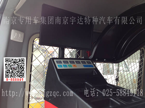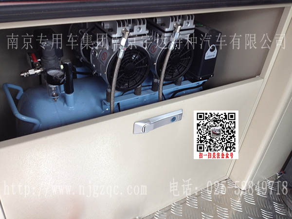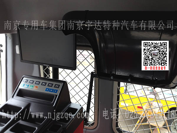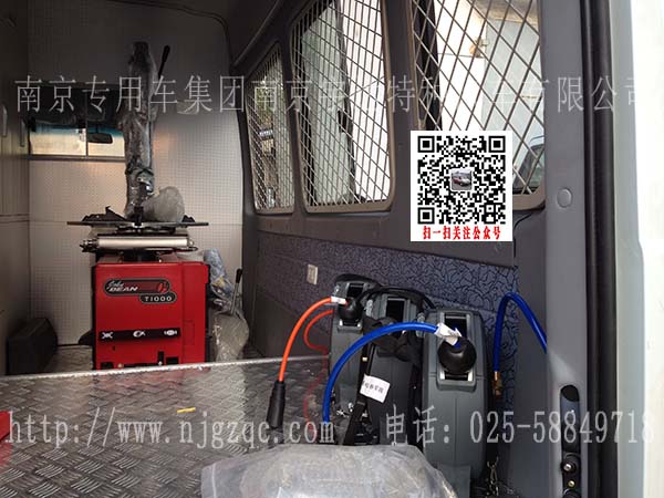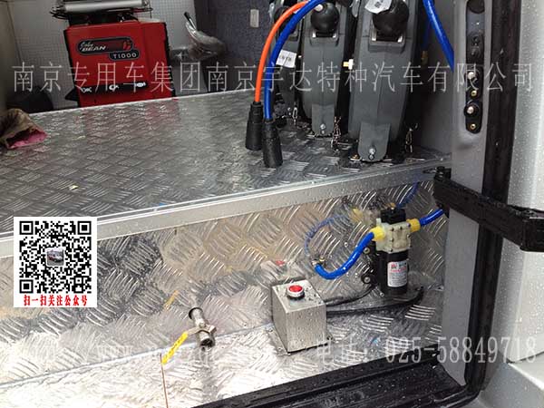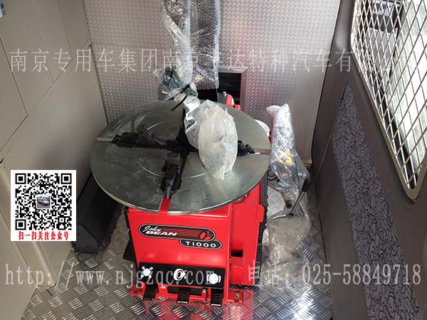 10、隔断后安装扒胎机,后舱轮包上安装不锈钢水箱,水箱上部安装动平衡机,车顶照明系统,电源系统,