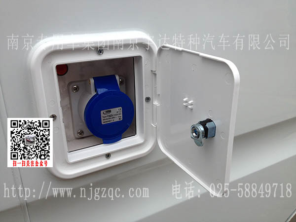 3、上掀门 后方,开启取电小门洞,门洞内焊接外接电源插座支架并做防水,车内地板焊接钢板预埋。
