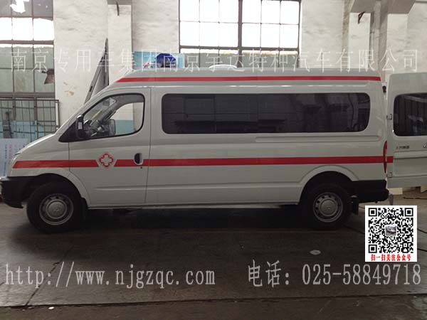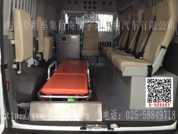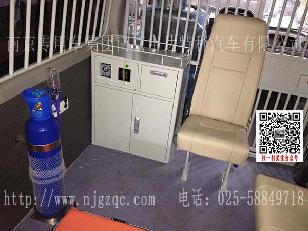 ①在整车的基础上增加救护标识、救护标志灯、救护隔断、输氧系统、乘员座椅、输液系统等
