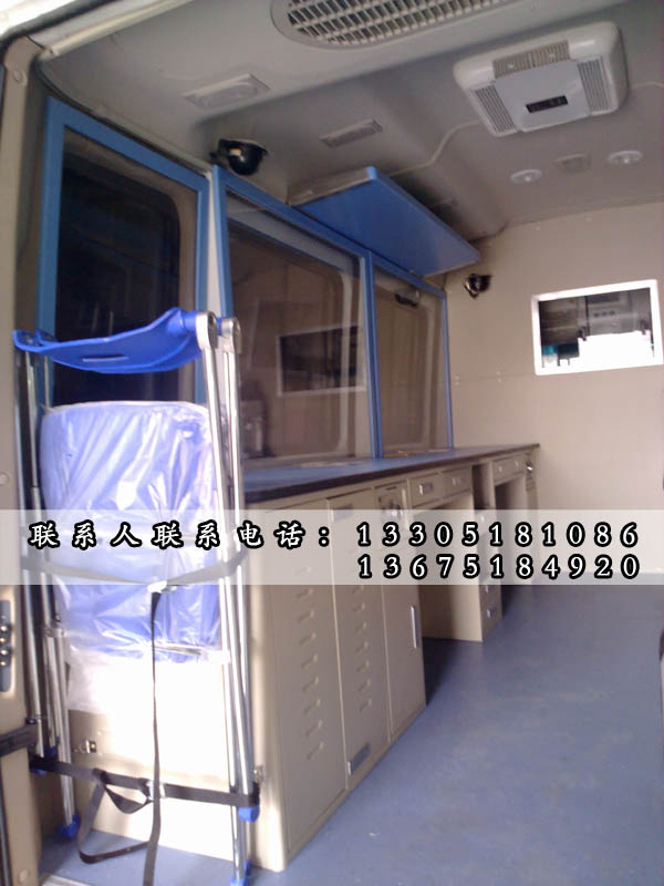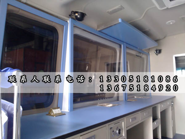 它装配有复印机、扫描仪、车体上掀窗、活动折叠工作椅、饮水机、保险柜、有机玻璃挡板、