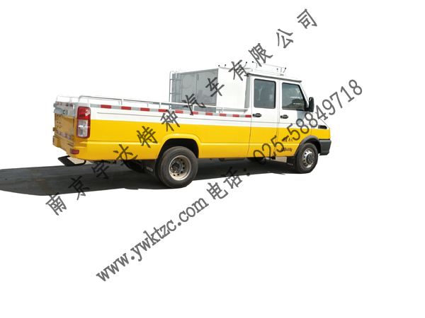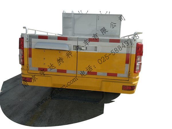 备注:车厢内配置装备柜及手提发电机,线缆绞盘,潜水泵等工具装备,主要用于电力电信,市政,公路养护等部门进行户外施工。车顶选装工具架,爬梯。选装货厢后门单开或对开。选装后踏板。车身左右两侧及后下部防护与车身一体,为裙边式围板防护,材质为金属,侧面防护离地高460mm,后下部防护离地高410mm。ABS系统控制器型号:BOSCH ABS8,ABS系统控制器生产企业:博世汽车部件(苏州)有限公司。该车发动机最大净功率93kW。
