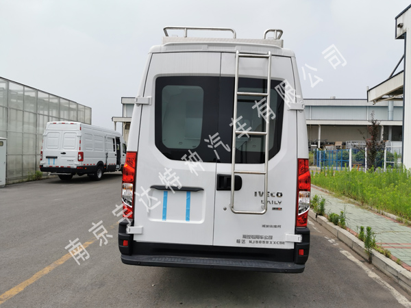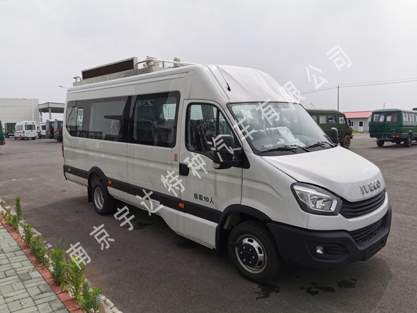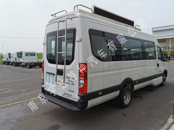 备注 装载有服务柜/台及电源系统、办公系统等服务设施.驾驶室与车厢采用中隔断分隔,可进行流动服务等功能.可选装换气扇,泛光灯,喇叭,顶置空调,倒伏灯,探照灯,摄像机组,上掀窗等.选装高位制动灯、电动门.随底盘选装宽后上车踏板时整车长度6075mm.整车高度2711mm,选装换气扇高度2792mm,选装泛光灯,喇叭车高2911mm,选装顶置空调高度3011mm,选装倒伏灯高度3061mm,选装摄像机组,探照灯高度3161mm.整车整备质量3075kg,选装顶置空调行李架,天线,设备机柜等整备质量3415kg.ABS系统控制器型号:BOSCH ABS9, ABS系统控制器生产企业:博世汽车部件(苏州)有限公司.发动机最大净功率105kW,油耗申报值为10.5L/100km.选装ESP.