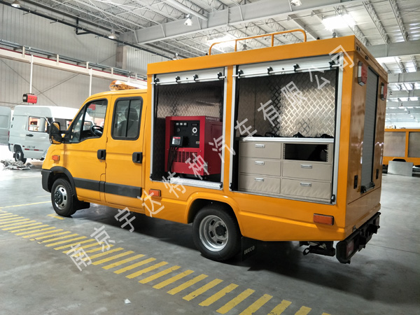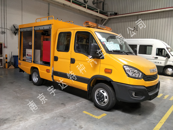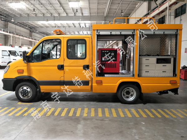 备注:整车加装箱体NQZYC-JX-N12、发电装置NQZYC-YC、绕线卷盘等装置,可选装车顶行李架、高杆灯、 探照灯、低顶方舱、后爬梯.选装高杆灯时整车高度为2910mm,选装探照灯时整车高度为2810mm,选装行李 架时整车高度为2810mm,无选装时整车高度2700mm,选装低顶方舱、高杆灯高度2610mm,选装低顶方舱、探 照灯高度2510mm,选装低顶方舱、行李架高度2510mm,选装低顶方舱时高度为2400mm.采用裙边结构代替侧 防护,侧防与车身为一体,材质为金属,侧防护离地高度420mm.后下部防护装置材料:钢板 ,连接方式:螺栓 。断面尺寸:槽形,断面高 215mm,槽深 100 mm ,离地高度410mm.ABS系统控制器型号:BOSCH ABS9, ABS系统控制器生产企业:BOSCH公司.发动机净功率105kW.