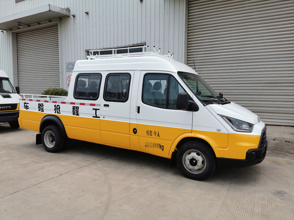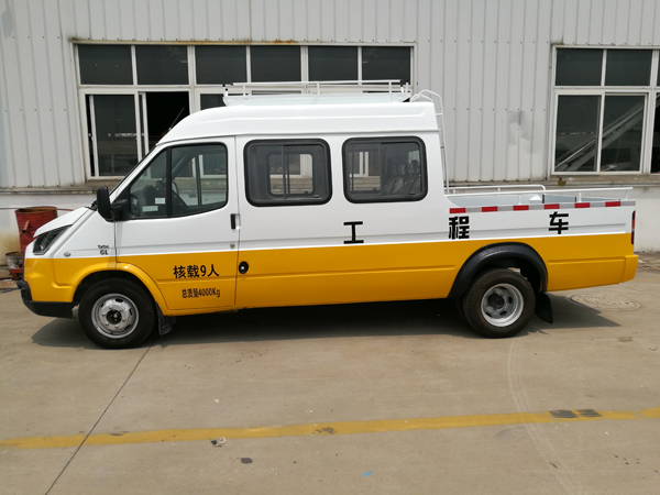 随底盘选装前脸外形、外后视镜,选装前雾灯,选装不同样式尾部货厢护栏。可取消车顶设备摆放架,取消后车高为2220mm;选装车顶设备摆放架高2460mm。装备便携式工具箱、电缆绕线盘等专用装置。侧防护及后防护为裙边结构,侧防护裙边离地最大距离为390mm,后防护裙边离地最大距离为470mm。ABS系统控制器型号:APG3550500G,ABS系统控制器生产企业:浙江亚太机电股份有限公司。随底盘选装发动机。JX493ZLQ6发动机最大净功率83kW,JX493ZLQ6B发动机最大净功率88kW。