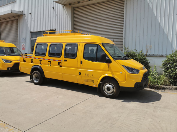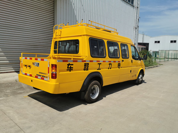 随底盘选装前脸外形、外后视镜样式,选装前雾灯,选装不同样式尾部货厢护栏。可取消车顶设备摆放架,车高2220mm,选装车顶设备摆放架车高2460mm。装备便携式工具箱、电缆绕线盘等专用装置。侧防护及后防护为裙边结构,侧防护裙边离地最大距离为390mm,后防护裙边离地最大距离为470mm。ABS系统控制器型号:APG3550500G,ABS系统控制器生产企业:浙江亚太机电股份有限公司。随底盘选装发动机。JX493ZLQ6发动机最大净功率83kW,JX493ZLQ6B发动机最大净功率88kW。